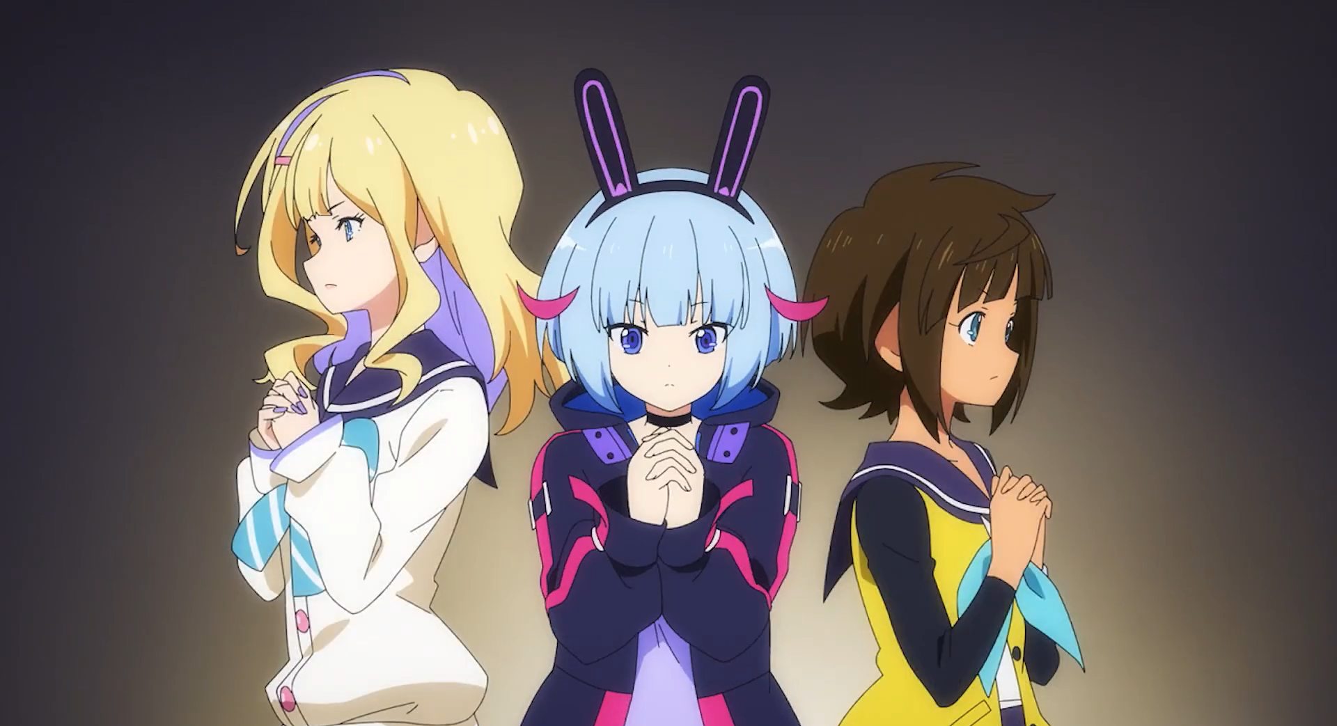 Ren, Shion and Tsubasa sheltering underneath an umbrella.