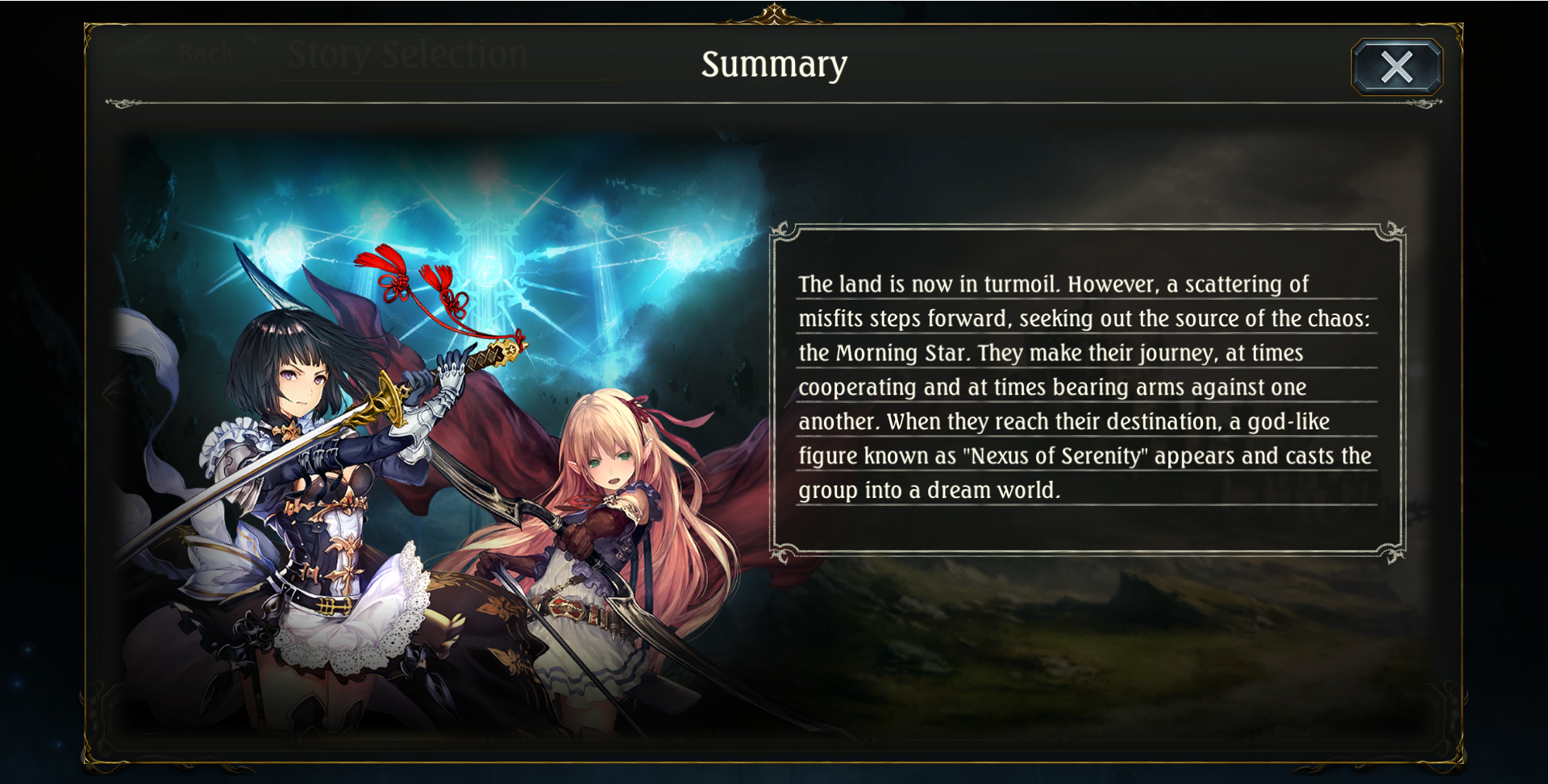 | “ | "The land is now in turmoil. However, a scattering of misfits steps forward, seeing out the source of the chaos: the Morning Star. They make their journey, at times cooperating and at times bearing arms against one another. When they reach their destination, a god-like figure known as "Nexus of Serenity" appears and casts the group into a dream world."